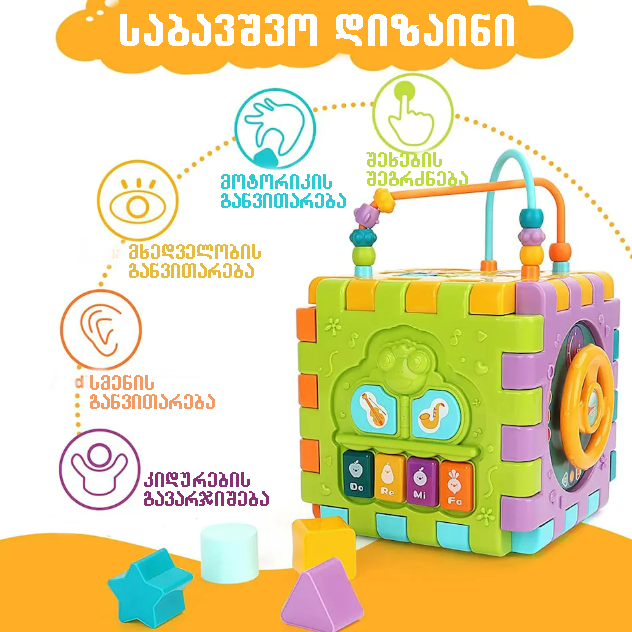 ხელს უწყობს ხელისა და თვალის კოორდინაციისა და წვრილი მოტორიკის განვითარებას მოჭერის, ქაჩვის, ბრუნვისა და დაჭერის მოძრაობებით. მისი მრავალფეროვანი აქტივობებითა და ინტერაქტიული ელემენტებით, პატარას შეუძლია საათობით იყოს ჩართული და გაერთოს.